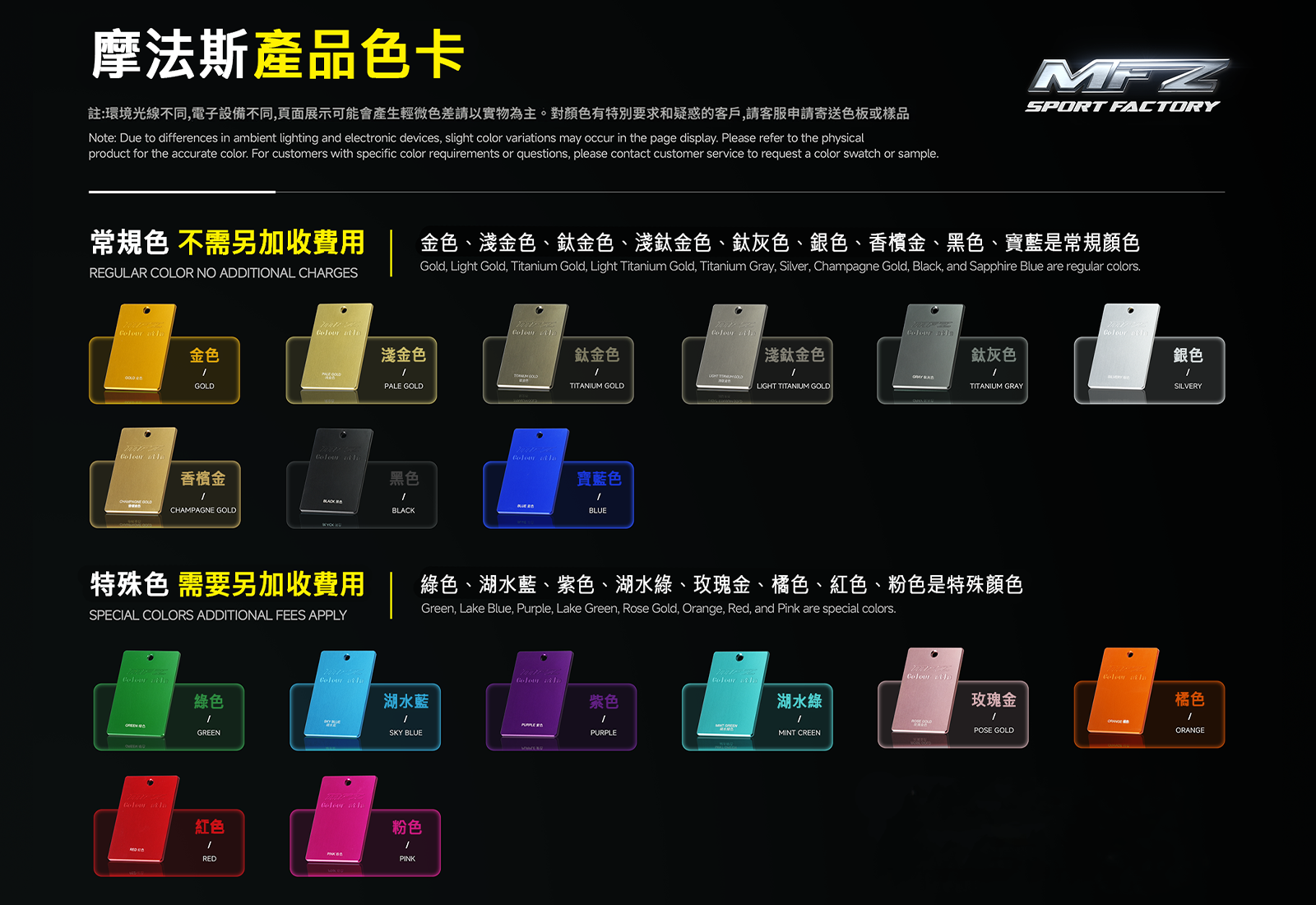- 金色、淺金、鈦金、淺鈦金、鈦灰